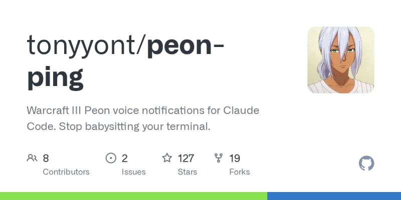 A terminal notification tool that plays Warcraft III Peon voice lines when Claude Code finishes tasks or needs permission. Solves the problem of missing notifications when you tab away from the terminal. Supports macOS and WSL2, includes multiple sound packs (Warcraft III, StarCraft, Red Alert 2), and offers CLI controls for