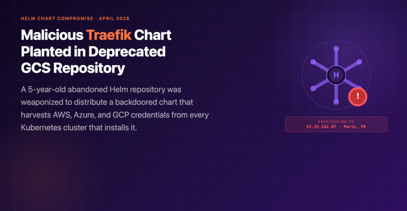 A malicious Traefik Helm chart (v39.0.7) was planted in the deprecated Helm stable repository at storage.googleapis.com/kubernetes-charts, which was officially archived in November 2020. The compromised chart injects an extra file (templates/helm-config.yaml) containing a base64-encoded shell script that harvests AWS, Azure, and GCP cloud credentials plus Kubernetes service account tokens via a pre-install Helm hook Job, then exfiltrates them via HTTP POST to rspds.de (51.15.242.87), a Scaleway VPS in Paris. The attacker set up the C2 domain on April 9, 2026 and the attack went live April 13. The malicious Job self-deletes after execution, leaving minimal forensic trace. Any organization still referencing the deprecated repo URL in Helm configs, CI/CD pipelines, GitOps configs, or IaC templates is at risk. Immediate actions include running `helm repo list` to check for the deprecated URL, rotating all cloud credentials for affected clusters, auditing Kubernetes Jobs for `helm-config` names, and verifying chart SHA256 against the official source at traefik.github.io/charts.