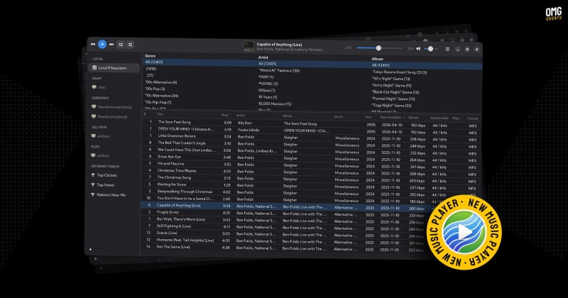 Tributary is a new alpha-stage music player for Linux written in Rust with GTK4 and libadwaita, designed to modernize the classic Rhythmbox/iTunes-style library interface. It supports local audio files as well as streaming from Jellyfin, Plex, DAAP/iTunes shares, internet radio, and Subsonic/Navidrome. The developer aims for
