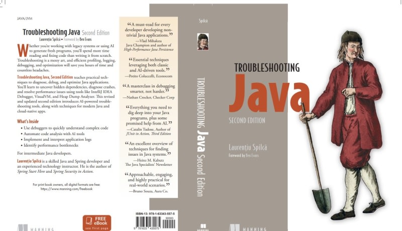 A review of the second edition of "Troubleshooting Java" by Laurentiu Spilca, covering debugging techniques, profiling with VisualVM, memory management, and distributed systems troubleshooting. The book spans 388 pages across 13 chapters, teaching developers how to use IDE debuggers effectively, profile applications, handle
