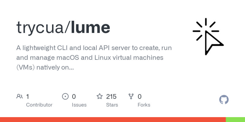 Lume is a lightweight CLI and local API server for creating, running, and managing macOS and Linux VMs with near-native performance on Apple Silicon using Apple's Virtualization Framework. Commands include creating, running, listing, and deleting VMs, among others. Pre-built images with SSH server and auto-login are available,
