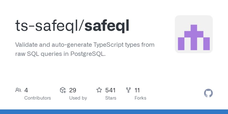SafeQL was built with monorepos and microservices in mind. It's easy to use with multiple database clients, including Prisma, Sequelize, Postgres, and more. SafeQL automatically infers the type of the query result based on the query itself. 1665766642.51667130s SafeQL works with any Postgres client, including prisma,Sequelize,.