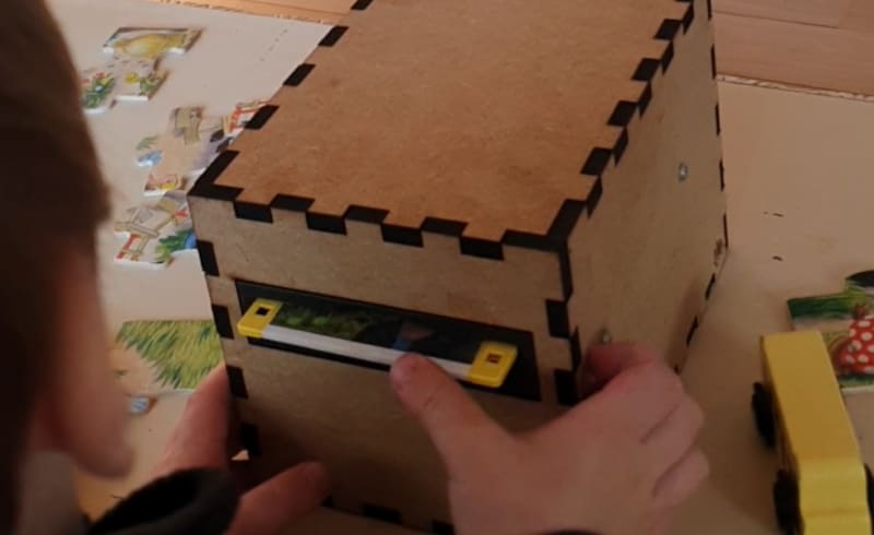 A hardware hacker built a TV remote control that uses physical floppy disks to select children's programming. When a disk is inserted into a real floppy drive connected to a microcontroller, it reads the stored data and streams the corresponding media to a Chromecast. Removing the disk stops playback. The battery-powered system