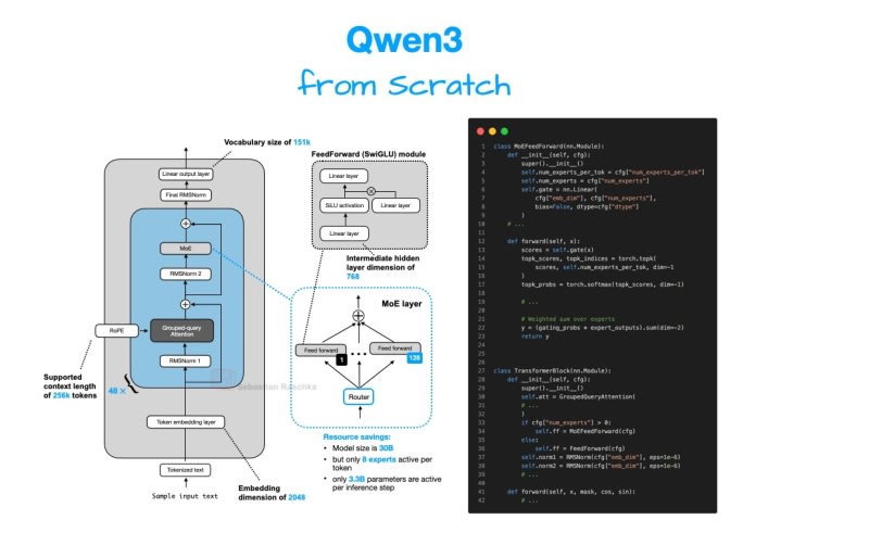 A comprehensive guide to implementing Qwen3, one of the leading open-source large language models, from scratch using pure PyTorch. The article explores why Qwen3 is popular among developers, including its Apache License v2.0, strong performance rankings, and variety of model sizes from 0.6B to 480B parameters. It provides
