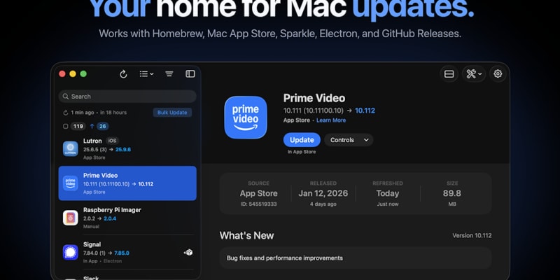 Updatest is a native macOS application that consolidates software updates from multiple sources (Homebrew, Mac App Store, Sparkle, Electron, and GitHub Releases) into a unified dashboard. It enables users to discover outdated applications, migrate manually installed apps to Homebrew management, view security details, and