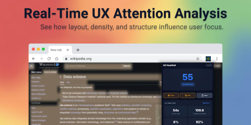UX HeatGrid is a Chrome extension that provides real-time grid-based heatmap visualization of user attention, content density, and layout balance on live web pages. It enables teams to identify where users focus, skim, or disengage during layout and content testing sessions.