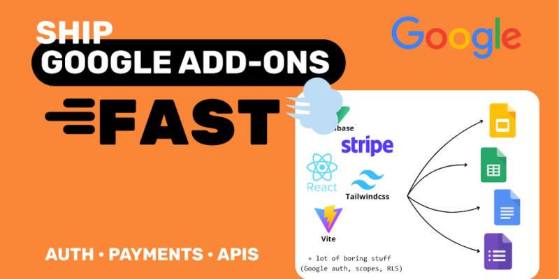ShipAddons is a production-ready boilerplate for building Google Workspace add-ons. It provides pre-configured authentication, frontend setup with React and Vite, backend infrastructure with Supabase, and billing integration with Stripe. The boilerplate uses TypeScript and TailwindCSS, allowing developers to skip the complex