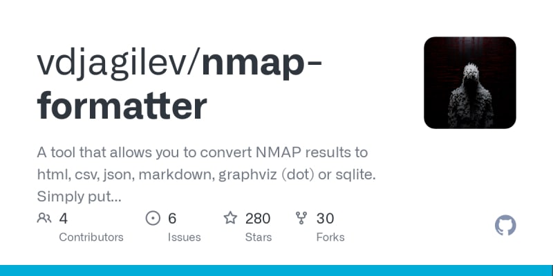 NMAP-Formatter is a tool that allows you to convert NMAP XML output to various formats such as HTML, CSV, JSON, Markdown, Graphviz (dot), or SQLite. It can also be used as a library in Go.