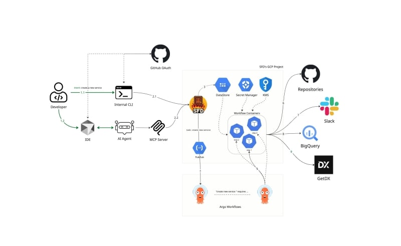 Mercari built Single Front Door (SFD), a unified platform interface that consolidates multiple developer tools and workflows into a single entry point. The system uses Argo Workflows to execute GitOps operations through CLI or AI-powered IDE integrations via Model Context Protocol. Key technical challenges included implementing