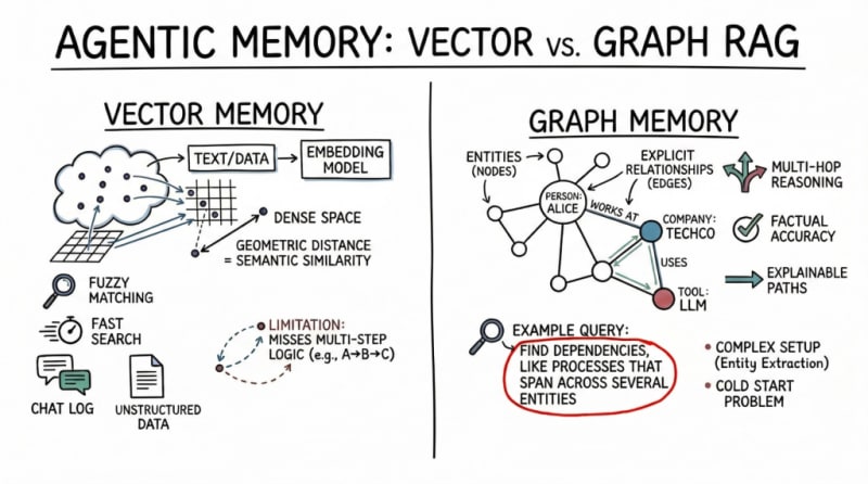 A comparison of vector databases and graph RAG as memory architectures for AI agents. Vector databases use dense embeddings for semantic similarity search, making them easy to set up and well-suited for unstructured data like chat logs and documentation. Graph RAG combines knowledge graphs with LLMs to represent entities and