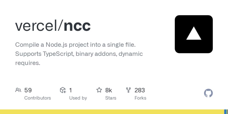 ncc is a CLI tool for compiling a Node.js module into a single file, with the motivation of publishing minimal packages to npm and shipping relevant app code to serverless environments. It has zero configuration and built-in support for TypeScript.