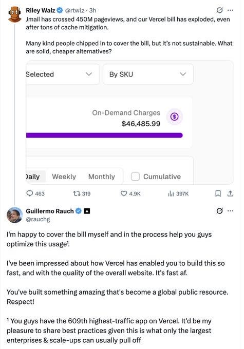 Vercel's CEO announced he will cover hosting expenses for 'Jmail', a site tracking Epstein files that has become highly trafficked. The offer involves AWS credits valued at $45k, generating discussion about the PR implications of the move.