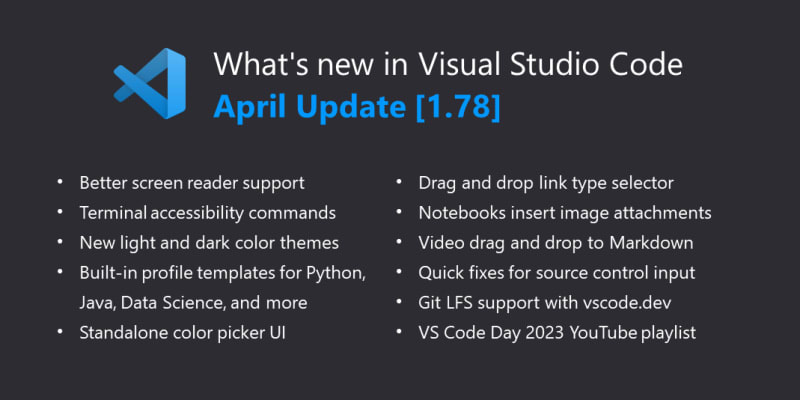Visual Studio Code April 2023 (version 1.78) Download the nightly Insiders build and try the latest updates as soon as they are available. New color themes- "Modern" light and dark color theme defaults. New default color themes replace 'Dark+' and 'Light Modern' as the new default dark and light color themes.