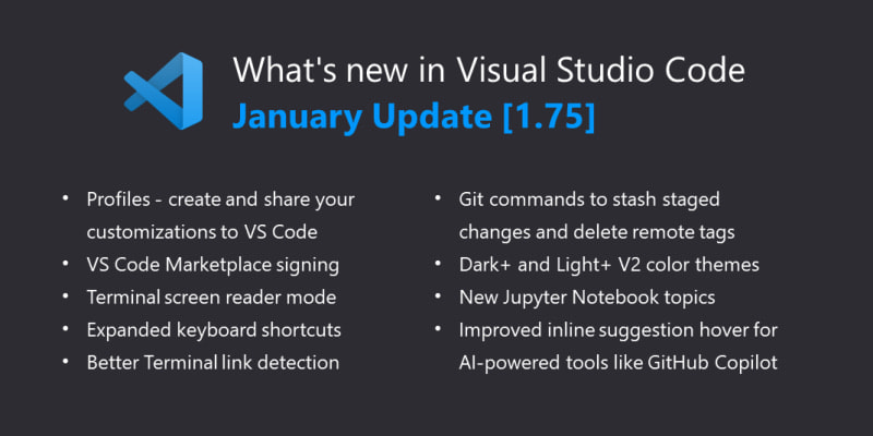 Visual Studio Code January 2023 (version 1.75) There are many updates in this version that we hope you'll like. Profiles- Create and share profiles to configure extensions, settings, shortcuts, and more.