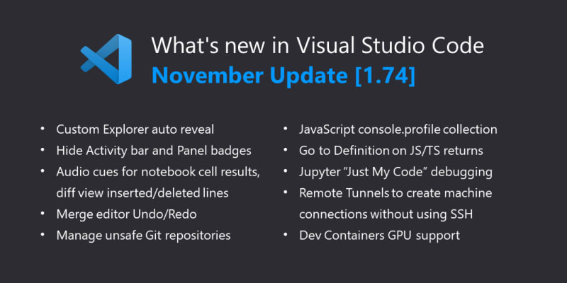 Visual Studio Code November 2022 November 2022 (version 1.74) Download the nightly Insiders build and try the latest updates as soon as they are available. The highly upvoted issue #87956 ("Allow to set explorer.autoReveal per specific folder") has been fixed by the introduction of a new setting.