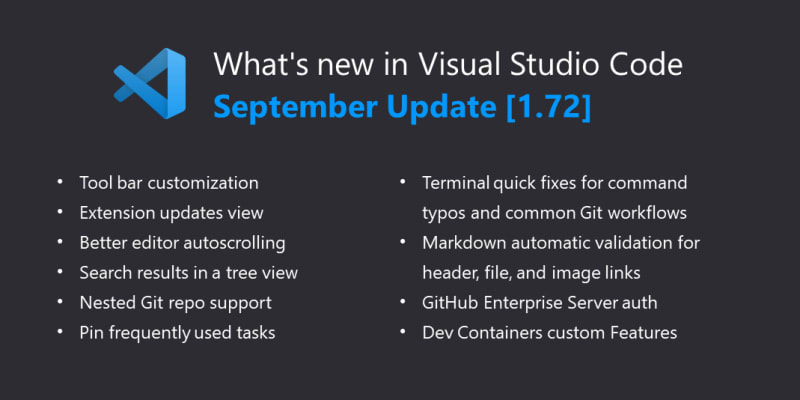 Visual Studio Code September 2022 September 2022 (version 1.72) There are many updates in this version that we hope you'll like. You can download the nightly Insiders build and try the latest updates as soon as they are available. The editor hover used to be very aggressive in hiding itself, especially when the mouse was going over an empty area.