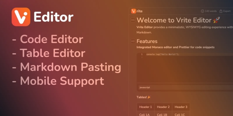 Vrite Editor is an open-source, minimalistic WYSIWYG Markdown editor to easily create and export Markdown and HTML content on the go. Vite Editor comes with many features to make editing a breeze. TipTap provides extensions for supporting Table formatting, the UI is a different story.