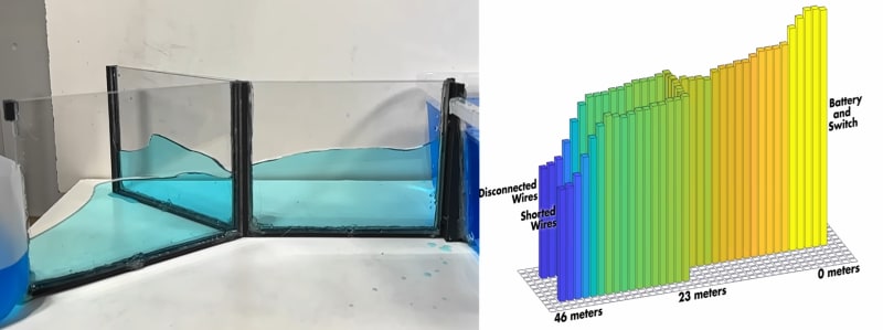 A hands-on demonstration of transmission line behavior using an oscilloscope and a twisted-pair Y-harness. By stitching together oscilloscope traces at intervals along a wire, voltage pulse propagation, reflection, and interference are made visible. A water model with acrylic channels mirrors the electrical behavior almost