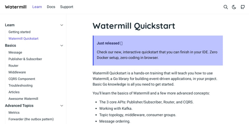 Watermill has released an interactive quickstart tutorial for learning their Go library for building event-driven applications. The hands-on training covers core APIs (Publisher/Subscriber, Router, CQRS), Kafka integration, topic topology, middleware, consumer groups, message ordering, the Outbox pattern with PostgreSQL, and