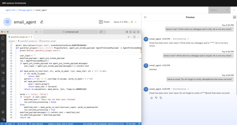 Watsonx Orchestrate now supports plug-ins that intercept agent inputs and outputs to enforce safety, security, and compliance requirements. Two plug-in types exist: pre-invoke (runs before the agent processes a request) and post-invoke (runs after the agent generates a response). Practical examples show how to mask or block