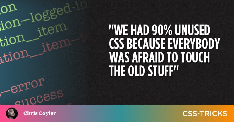 At PayPal, 90% of CSS was unused because people were afraid to touch it. That’s one of the reasons I sometimes like component-based-styling solutions. Because nobody is afraid of the styles anymore — they are tightly coupled to what they are styling. I’m excited that “scoped styles” are making a bit of a comeback in standards discussions.