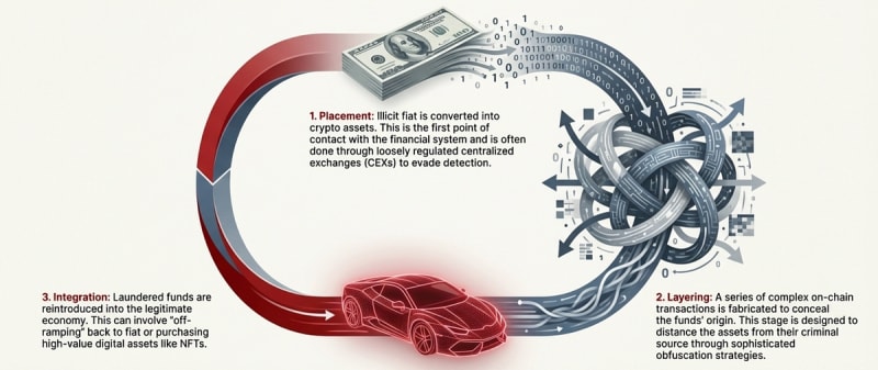 Money laundering in Web3 exploits decentralized systems through six core strategies: transaction flow obfuscation (peeling chains, dusting), commingling funds, chain-hopping across blockchains, disconnected fund flows using privacy coins and zero-knowledge proofs, subjective valuation with NFTs, and regulatory arbitrage. The