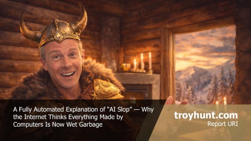 Troy Hunt reflects on receiving AI-generated content criticism on Mastodon after writing a detailed privacy post, while his colleague Scott Helme received different negative feedback for a solar system cost analysis. Hunt observes how commenters focus on trivial details like AI-generated illustrations rather than substantive