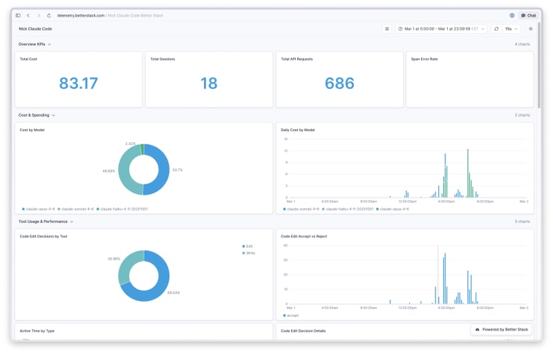 A developer shares insights from setting up a Claude Code telemetry dashboard using BetterStack and OpenTelemetry. Key findings include: Anthropic is heavily subsidizing Claude Code (API costs are roughly 9x the subscription price), subagents silently default to cheaper models like Haiku and Sonnet, token volumes are dominated