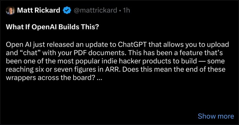 Open AI has released an update to ChatGPT that enables users to 'chat' with PDF documents. This update may lead to increased competition and lower margins in the market for similar products. Large companies like OpenAI face unique challenges when entering new markets.
