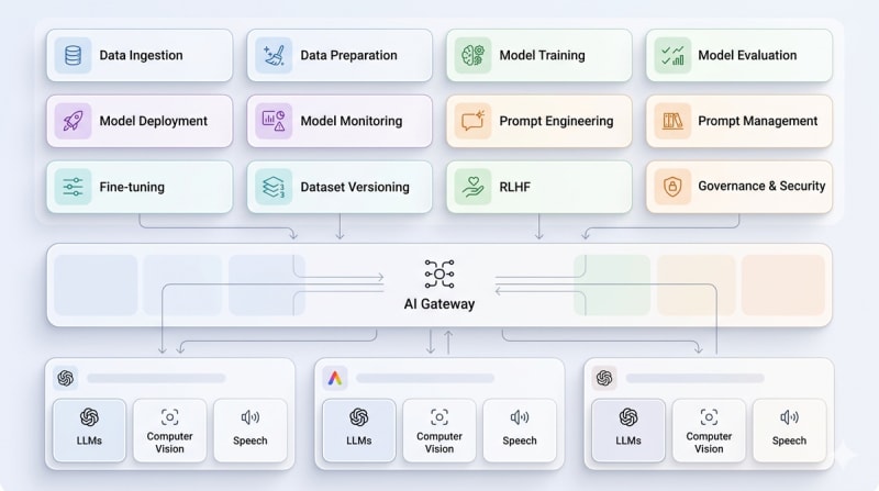 AI lifecycle management covers the full process of building, deploying, and continuously improving AI systems in production. Key pillars include defining use cases with clear success metrics, data governance and access control, ongoing model selection and evaluation, versioned prompt and agent management, security with RBAC and