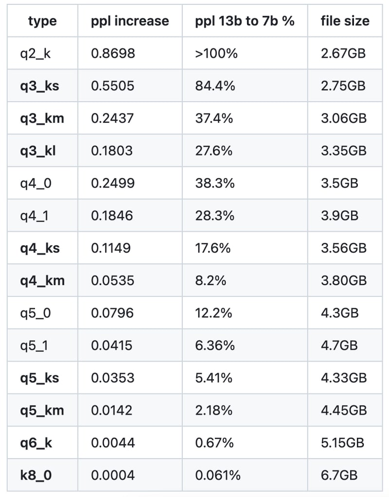 Quantization methods for LLM, including Q3_K_S, Q4_K_M, Q4_0, and Q8_0, are discussed. The K_M models are recommended for their balance between size and perplexity. Implementation details of llama.cpp for quantization are provided.