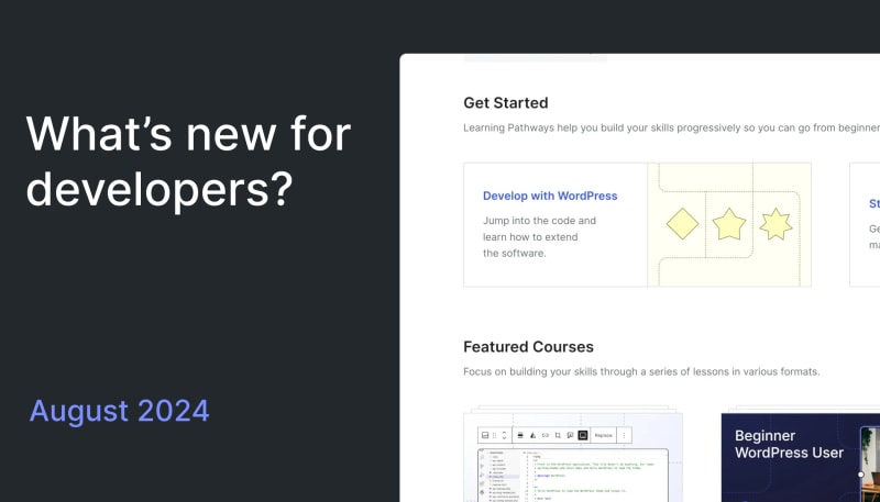 August 2024 brought several updates for WordPress developers. After the release of WordPress 6.6 'Dorsey' and its subsequent patch, focus shifts to future versions. Notable highlights include a redesigned Learn WordPress site, offline mode and PWA support for WordPress Playground, and numerous enhancements to Gutenberg blocks.