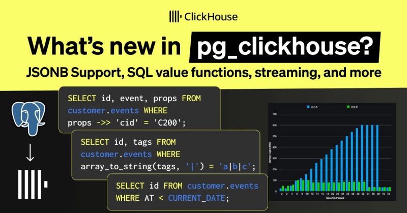 pg_clickhouse, the PostgreSQL extension for querying ClickHouse databases, has received several notable updates. Version 0.1.10 added JSONB accessor operator and function pushdown (including ->, ->>, jsonb_extract_path, jsonb_extract_path_text) that translates to ClickHouse sub-column syntax. Version 0.2.0 improved pushdown for SQL date/time value functions like CURRENT_DATE, CURRENT_TIMESTAMP, clock_timestamp(), and others, ensuring timezone-aware translation to ClickHouse equivalents. Array function pushdown was also added, mapping Postgres functions like array_cat, array_to_string, and string_to_array to their ClickHouse counterparts. Additionally, HTTP result set streaming was introduced, buffering ~50MB at a time instead of loading entire result sets into memory — reducing peak memory usage from 600MB+ to under 86MB when querying large datasets like NYC taxi data.