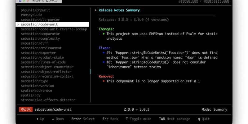 WhatsDiff is an open-source CLI tool that displays what changed after running composer or npm update commands. It provides an interactive terminal interface for viewing dependency changes, aggregated changelogs, and risk assessment. The tool supports JSON/Markdown output for automation, CI/CD integration with exit codes, and includes an MCP server to assist with upgrades.