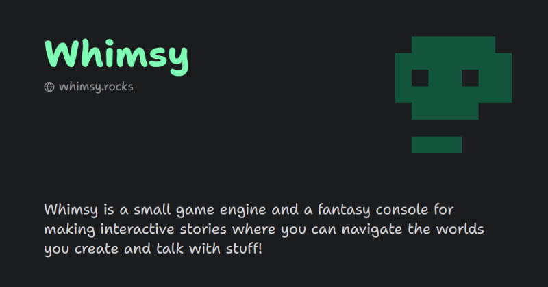 Whimsy is a beginner-friendly game engine and fantasy console designed for creating interactive narrative games without coding. It features a visual scenario editor with drag-and-drop blocks, built-in pixel art tools, pre-implemented game mechanics like character movement and dialogue systems, instant playtesting, and