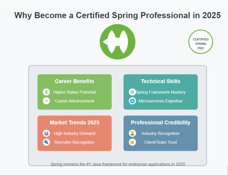 Becoming a Certified Spring Developer in 2025 can significantly enhance your career prospects by unlocking higher salaries, ensuring growth, and differentiating you from other Java developers. The certification process helps you master core Spring concepts, including Spring Boot, Security, and Cloud, while providing hands-on