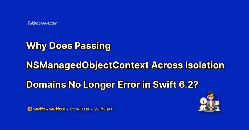 When NSManagedObjectContext stops triggering concurrency errors in Swift 6.2 (Xcode 26), the reason isn't an improved compiler — it's a change in how Core Data's SDK imports the type. In Xcode 26, NSManagedObjectContext's header now carries NS_SWIFT_SENDABLE and NS_SWIFT_NONISOLATED annotations, making it a Sendable type in