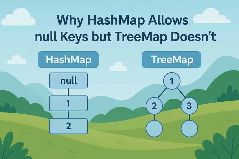 HashMap allows null keys by storing them in a special bucket without calling hashCode(), while TreeMap throws NullPointerException because it requires key comparison for maintaining sorted order. TreeMap can accept null keys with a custom Comparator that handles null values. Both maps allow only one null key, which gets