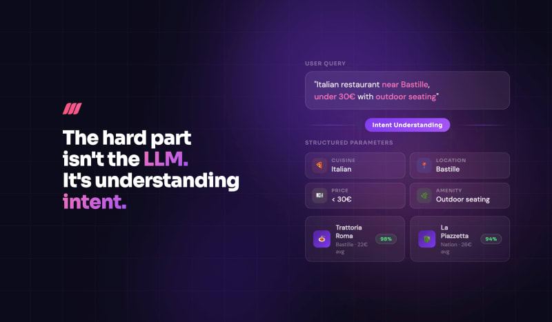 Intent understanding — translating natural language queries into structured search parameters — is the hardest unsolved problem in AI-powered search, not LLM integration. Using The Fork's restaurant discovery app as a case study, the post illustrates how queries like 'Italian restaurant near Bastille for under 30€ with outdoor