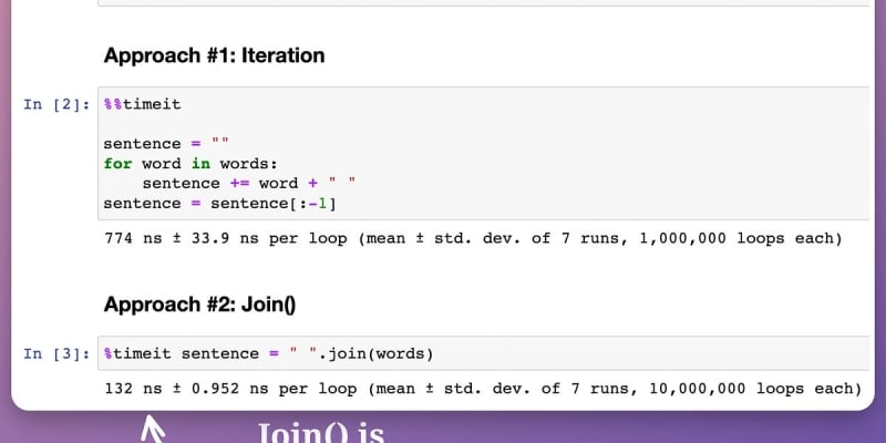 Using Python’s join() method for string concatenation is significantly faster than iterating and appending strings. This is because join() can allocate memory in a single call by knowing the number of strings and spaces beforehand, whereas iteration requires repeated memory allocations for each element and separator. This optimization improves runtime and memory utilization.