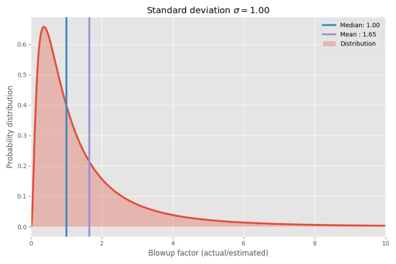 Software estimation is systematically biased because developers estimate the median completion time well, but the mean is far higher due to the log-normal distribution of actual vs. estimated time. Using empirical data, the median blowup factor is exactly 1x while the mean is 1.81x. When summing multiple tasks, high-uncertainty tasks dominate the total time — a single task with σ=2 can dwarf all others combined. Fitting a Student's t-distribution to real project data reveals that the 99th percentile blowup is 32x, and the theoretical mean blowup factor for any unknown task is actually infinite. The practical takeaway: instead of summing estimates, identify and focus on the highest-uncertainty tasks, as they will dominate delivery timelines.