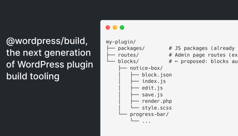 @wordpress/build is a new build tool for WordPress plugins that replaces webpack and Babel with esbuild, offering significantly faster builds and zero-config convention-based discovery. It auto-generates PHP script registration files from package.json conventions, supports scripts, script modules, and styles in a single pass,