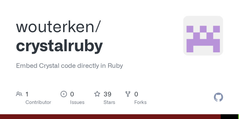 SyntaxGetting StartedTypesComposite Types (using JSON serialization)Named TypesExceptionsInstalling shards and writing non-embedded Crystal codeWrapping Crystal code in RubyRelease BuildsTroubleshootingDesign GoalsInstallationDevelopmentContributingLicenseCode of ConductSort: