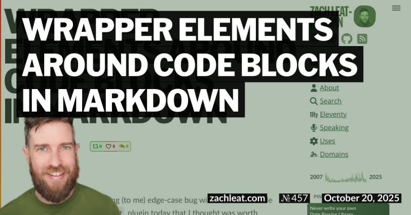 Explores an edge-case bug in markdown-it where wrapping code blocks in HTML elements (like divs) causes unwanted paragraph tags to be inserted. The issue occurs when preprocessing Markdown with syntax highlighting plugins that return wrapped HTML. Provides workarounds including using triple backtick syntax instead of pre tags,