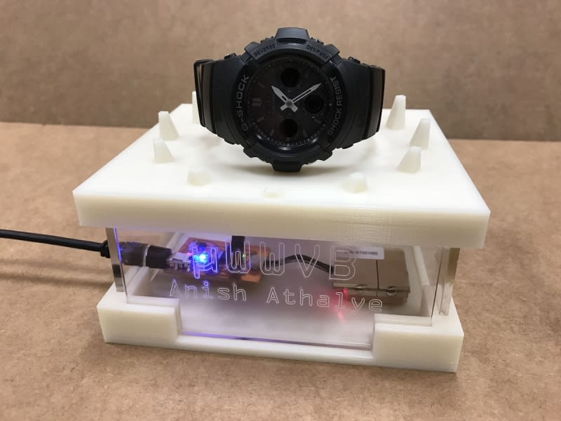 μWWVB is a DIY watch stand that emulates the WWVB atomic clock radio signal to automatically synchronize radio-controlled wristwatches where the real WWVB signal is unavailable. The project uses an ATtiny44A microcontroller, a GPS module for accurate time acquisition, and a repurposed ferrite antenna to broadcast a 60 kHz