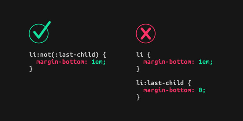 An enabling selector is what I call a selector that does a job without disabling the particular rule. Let's say we have list items and we want to add the margin to every one except the last one. First, we add margin-bottom to all elements. Then, we disable the bottom margin on the last element.