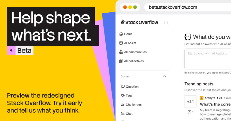 Stack Overflow has launched a public beta of its redesigned platform at beta.stackoverflow.com. The redesign includes an updated design system with new colors, typography, and icons; a wider web layout for large monitors; simplified navigation; and new ways to share knowledge beyond single-answer Q&A, including experience-based