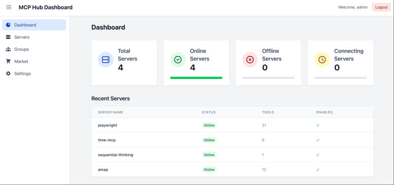 MCPHub is a unified management platform that consolidates multiple Model Context Protocol (MCP) servers into a single Server-Sent Events (SSE) endpoint. It provides a dashboard for monitoring server status and simplifies infrastructure management for AI applications. The tool can be quickly deployed using Docker and allows customization through JSON configuration files.
