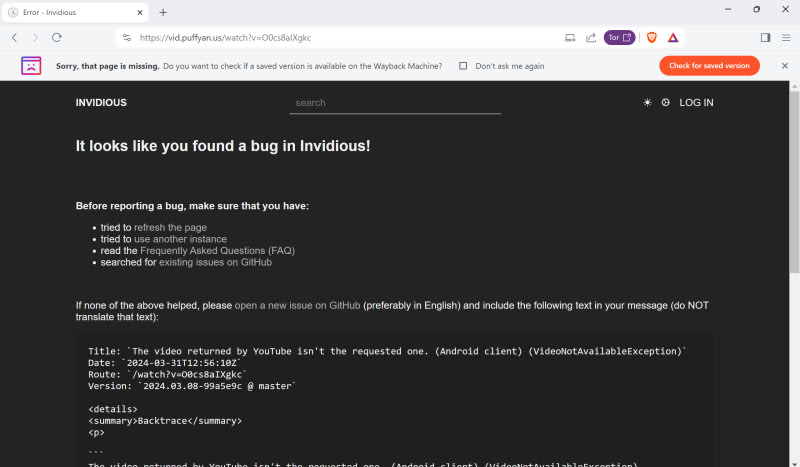 Invidious instances for YouTube videos are currently broken, and there is no fix yet. Google's changes may be locking out alternatives and tightening access to YouTube, potentially increasing revenue. The issue has been reported on GitHub and affects other frontends like Piped as well.